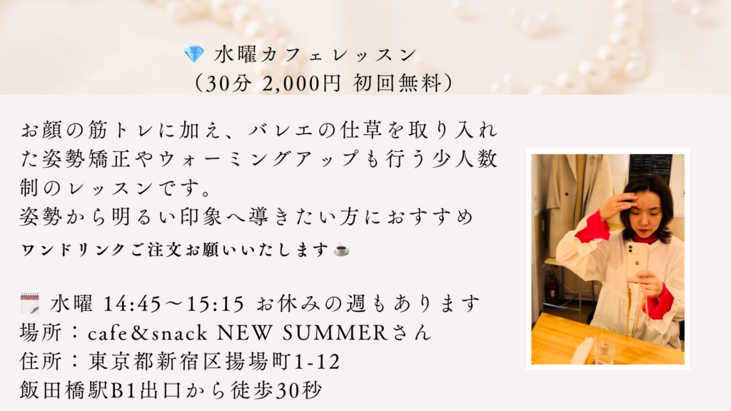 バレエのしなやかさを取り入れた美顔筋トレリアルレッスンや、
